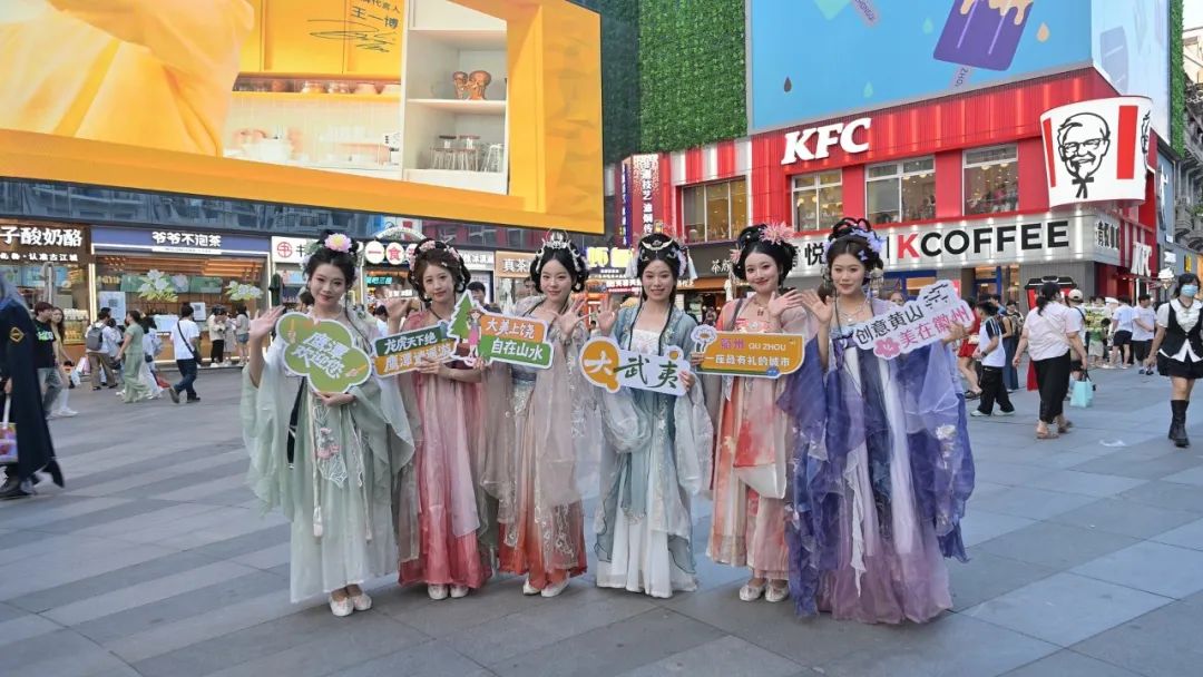 户外路演成为本次活动的点睛之笔。15日晚,户外文旅市集摇身一变成为“微型长三角文化体验区”,福禄铜葫芦、黄蜡石手串、徽墨、建本框、三清山米粒石等文创精品琳琅满目;身着古装的NPC沿步行街开展快闪巡游,与市民热情互动,并以灵动的舞蹈与五市特色节目展演一起点亮汉江路步行街,引得市民游客纷纷驻足。同步设置的互动游戏区和旅游咨询区,也让武汉市民在沉浸式体验中深度认知五市文旅资源。